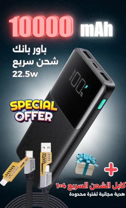 - شحن سريع بقوة 25 واط: استمتع بأسرع تجربة شحن ممكنة! منفذ Type-C يدعم إخراجًا بقوة 25 واط، بينما يوفر منفذا USB-A قوة 22.5 واط لكل منهما. هذا يعني أن أجهزتك ستشحن بسرعة فائقة لتعود للعمل في أقل وقت ممكن.